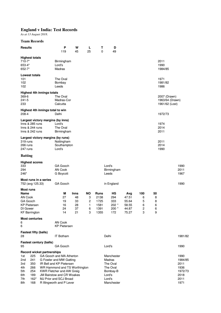 England v India Test Records