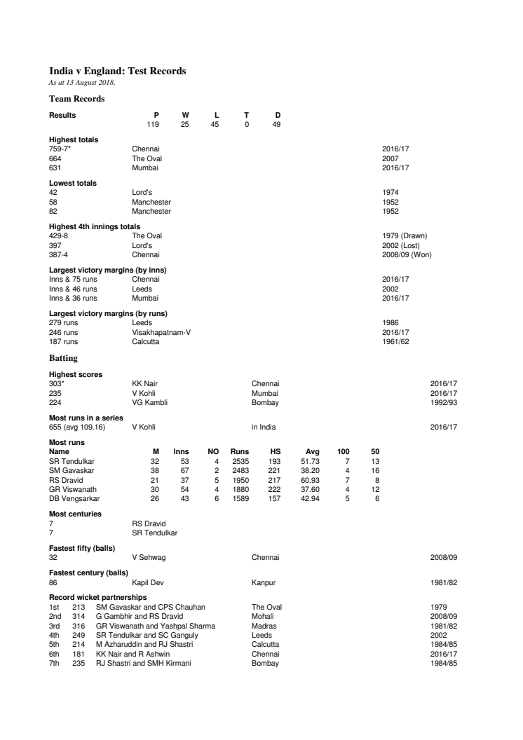 India v England Test Records