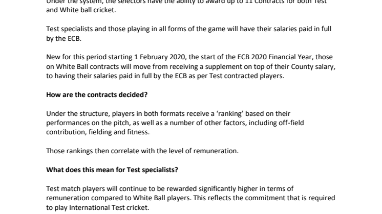 Test specialists and those playing in all forms of the game will have their salaries paid in full by the ECB. From 1 February 2020, the start of the ECB 2020 Financial Year, those on White Ball contracts will move from receiving a supplement on top of their County salary, to having their salaries paid in full by the ECB as per Test contracted players.